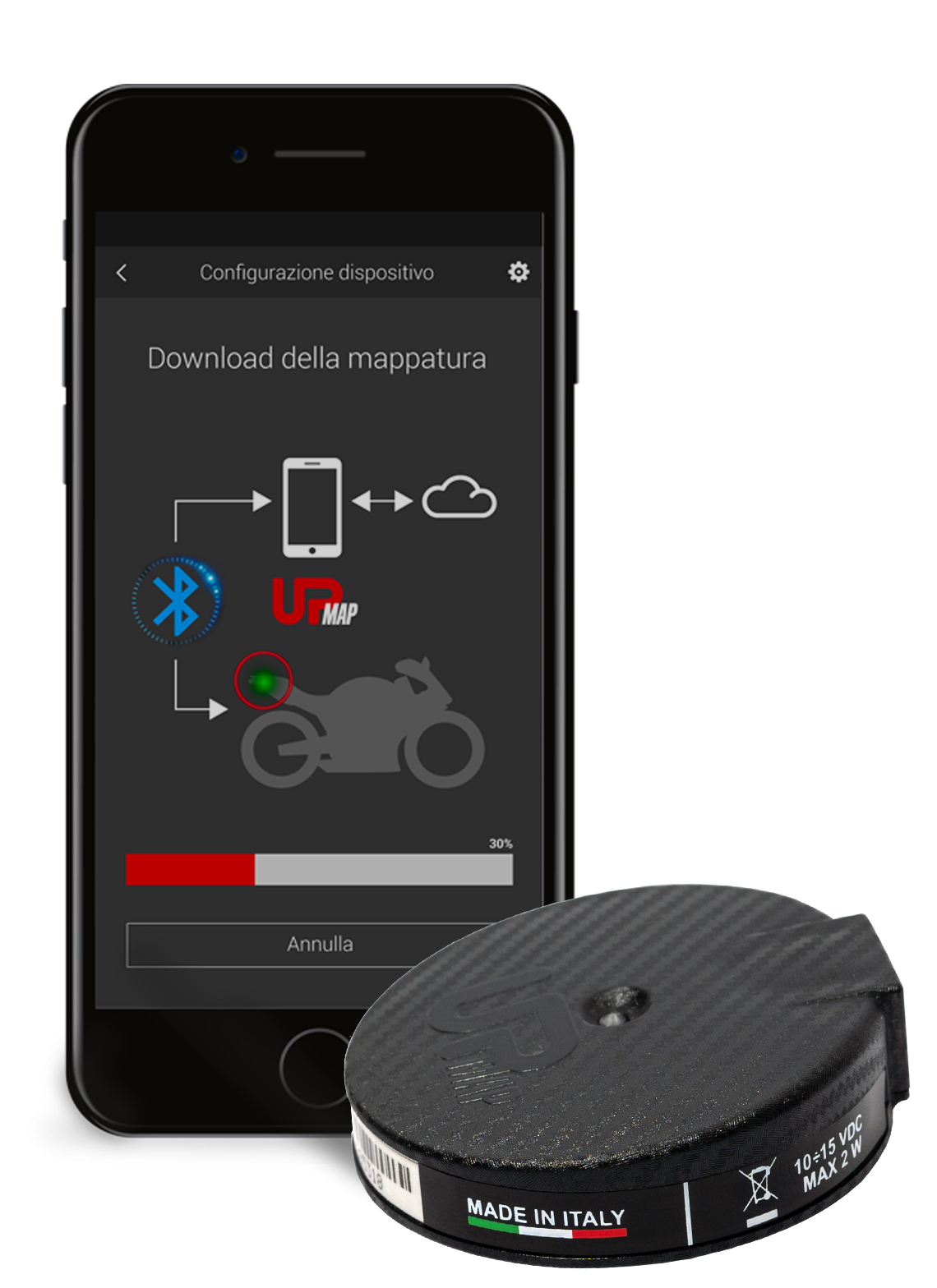 UpMap T800 คือ อุปกรณ์เชื่อมต่อมอเตอร์ไซค์กับสมาร์ทโฟน เพื่ออัปโหลดซอฟต์แวร์ (ECU Flash) หรือแผนที่ที่ปรับแต่งโดยผู้เชี่ยวชาญ โดยเชื่อมต่อผ่านบลูทูธและการเชื่อมต่อกับสาย(diagnostic cable) ของรถ. อุปกรณ์นี้ช่วยให้ผู้ใช้งานสามารถปรับแต่งการตั้งค่าต่างๆ ของรถได้ง่ายๆ ผ่านแอปพลิเคชัน UpMap บนมือถือ.