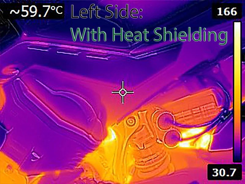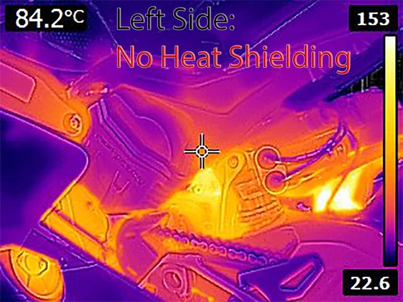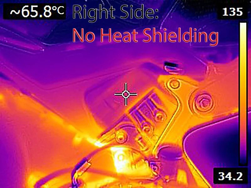 Check out the thermal imaging, which showcases a huge difference in seat/bodywork temperature after installation of the heat shield kit. These were taken on a FLIR thermal camera after a 40-minute ride consisting of about 30 minutes freeway, and 10 minutes on local streets.